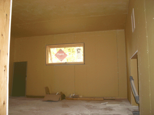家の内側を余すところなくプラスター・ボードで覆いつくす。貼り合わせ面のすきまをなくす、凹凸を生じさせない、開口部にフィットさせる、こんなところが留意点。