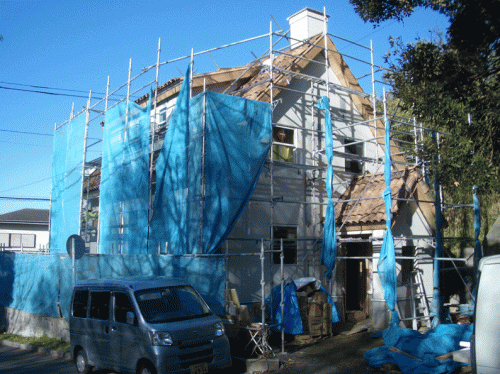 下地のサイディングで全体をいったん覆う。外壁の仕上げはレンガタイルだが、それを張り詰めていくいくための構造用サイディングを用いる。