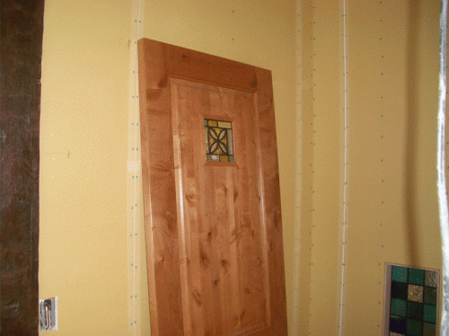 ドアの塗装を行った。取り付ける前に念入りに塗装する。 ドアはアメリカ・シンプソン社製。それをウッドランドの井上さんが輸入担当し、YUMAさんが買ってきたステンドグラスを現場で組み込み、そうしてやっとこ石川塗装さんが塗装をする。この後、建具屋さんが入口につり込み、YUMAさんご指定のドアノブをウッドランドの井上さんに頼み輸入し、再び現地で建具屋さんに取り付けてもらう。 なかなか手の込んだドアだ。