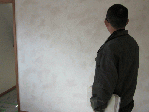 壁の仕上がりを試しに一部屋、佐藤左官さんが塗った。 素材はスイス製の漆喰カルクウォール。YUMAさんのリクエストは、白と茶を混ぜて意図的にムラを出すというアーティスティックな仕上がり。 YUMAさんにはあらかじめ50㎝角ほどのサンプルを佐藤左官さんが作り、その風合いは確認してあった。 それでも、部屋全体となると、また違う。一部屋ぐるりと見た細井ちゃん、5分ほどそこから動かない。 「微妙にちがうねぇ」 さてさて、どう違う、どうする。