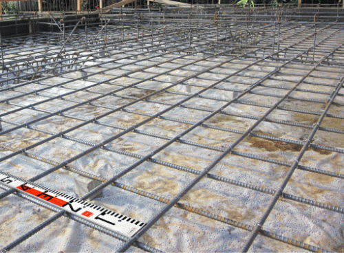 コンクリートに埋め込まれる前、行われる鉄筋の検査。規定のスケールを当てて確かめる。交差点はしっかりと結束されているか、時には足で踏む。素材の色はモノトーン、構成はシンプル。だから確認方法もクールでドライ。