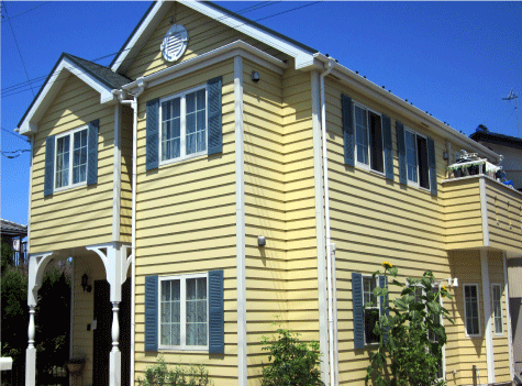 黄色いラップサイディング。ラップサイディングメーカーの東レはこれをマスタード・イエローと称しているが、カラシというよりひまわり。サンフラワー・イエローという印象。田村さんだって庭にひまわりを植えている。