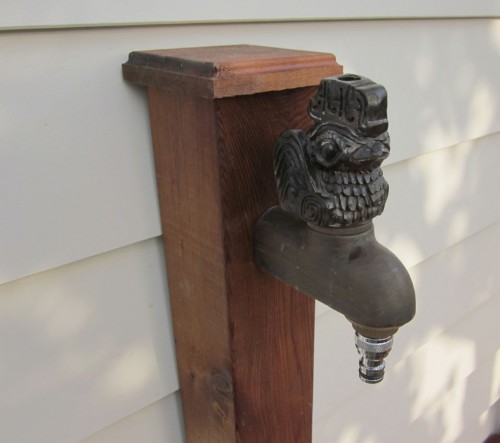 井田さんの家の外水栓。蛇口を見たら、沖縄のシーサーの彫りもんだろうか? 見慣れない取っ手がついていた。